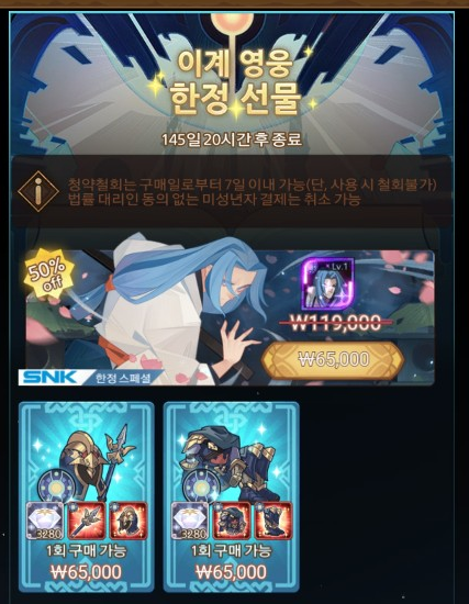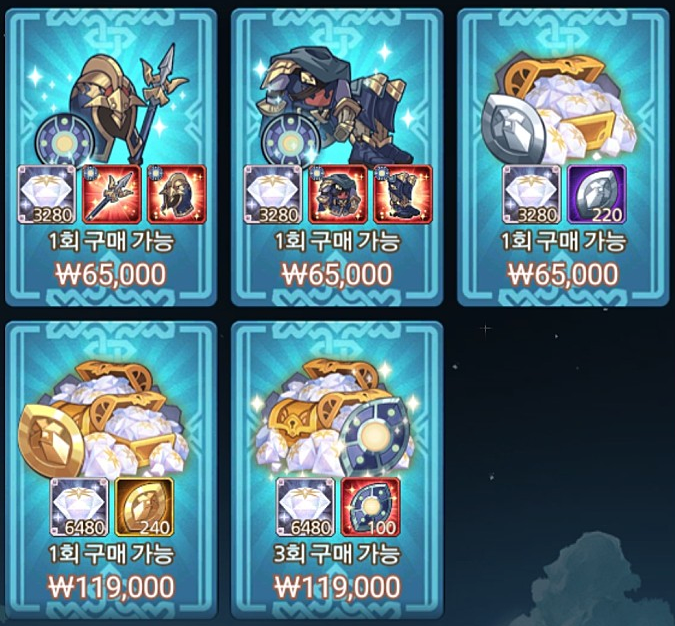 같이 출시한 이계 영웅 한정 선물은, 장비의 경우 인게임에서 충분히 구할 수 있으니 가성비가 떨어집니다.